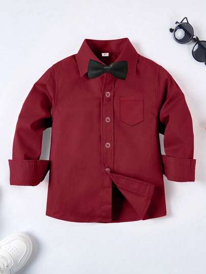 6-16岁男童长袖衬衫,婚礼正装衬衫,派对衬衫,带口袋和领带,酒红色 - 酒紅色 - 查看 1