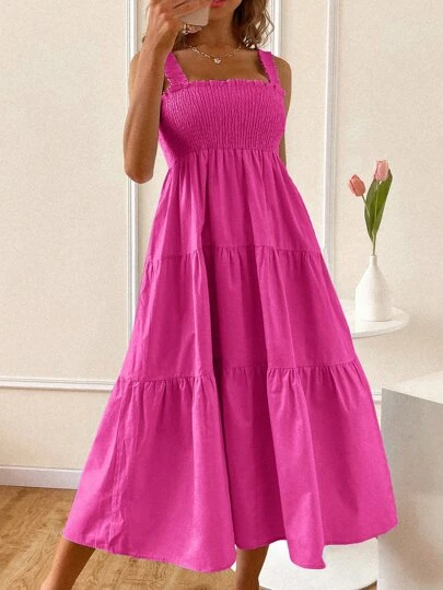 SHEIN VCAY 素色打褶傘擺吊帶連衣裙 - 玫紅色 - 查看 1
