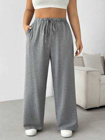 SHEIN EZwear 大码女式纯色简约抽绳休闲灰色阔腿运动裤,初秋 - 灰色 - 查看 1
