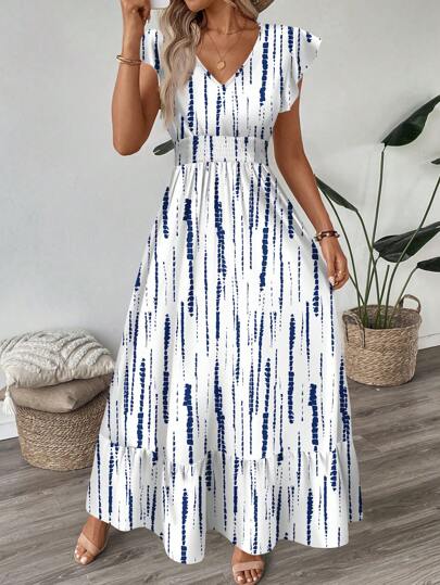 SHEIN LUNE 复古扎染条纹褶皱盖袖收腰荷叶边下摆 A 字长裙,豹纹,女士休闲度假优雅服饰,春夏季度假连衣裙 - 彩色 - 查看 1