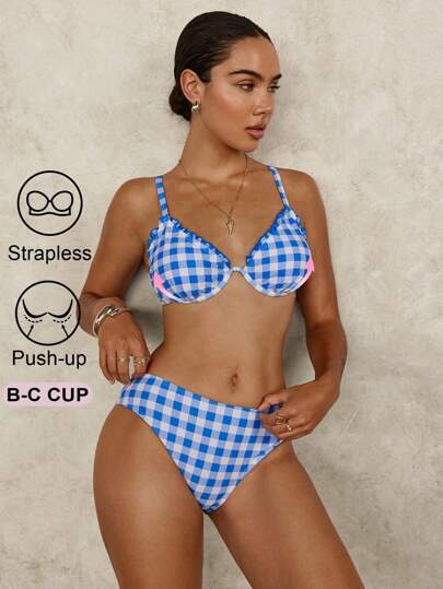 SHEIN Swim 聚拢格纹比基尼套装,甜美风格泳装,适合夏季海滩度假 - 藍白色 - 查看 1