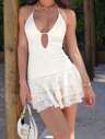 优雅时尚荷叶边肩带蝴蝶结设计蕾丝拼接无袖紧身迷你连衣裙