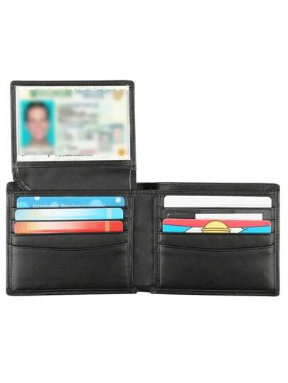 RFID屏蔽双折真皮钱包 - 双证件窗口,黑色礼品袋,男士钱包,小巧钱包,真皮 - 黑色 - 查看 1