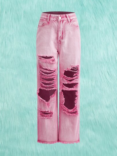 ROMWE Kawaii 破洞毛邊直筒牛仔褲 - 粉色 - 查看 1