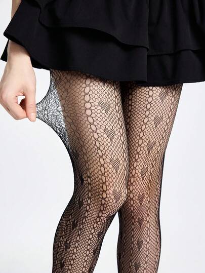 ROMWE Goth 1双女士黑色心形带扣渔网袜,四季皆宜 - 純黑色 - 查看 1