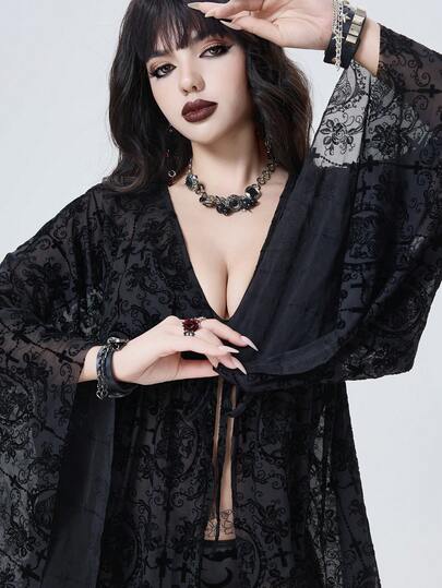 ROMWE Goth 女士夏季度假薄纱宽松蝙蝠印花和服罩衫 - 黑色 - 查看 1