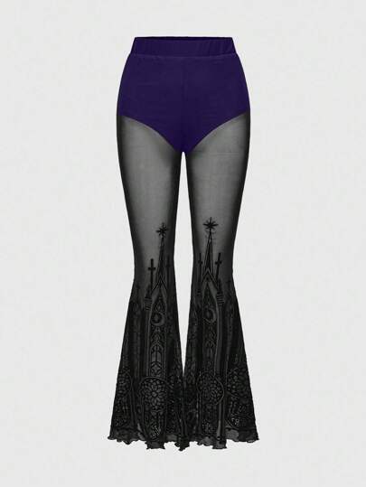ROMWE Goth 哥特式复古城堡植绒印花透明女式喇叭裤 - 紫色 - 查看 1