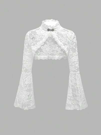 ROMWE Goth 女款哥特風格分襟蕾絲背心,前開衩式,袖子擴口設計 - 白色 - 查看 1