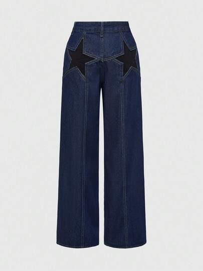 ROMWE Grunge Punk Y2K Baddie Chilling Star 印花超低腰宽松直筒牛仔裤 - 藏蓝色 - 查看 1
