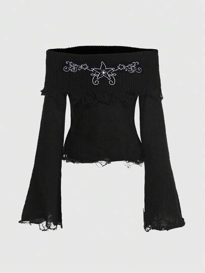 ROMWE Hippie 一字肩鐘形袖花卉刺繡仿舊邊套頭毛衣