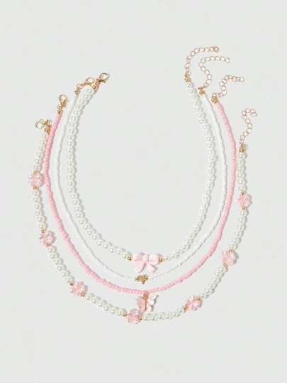 ROMWE Kawaii 4 件装粉色心形和蝴蝶吊坠人造珍珠串珠项链情人节 - 粉色 - 查看 4