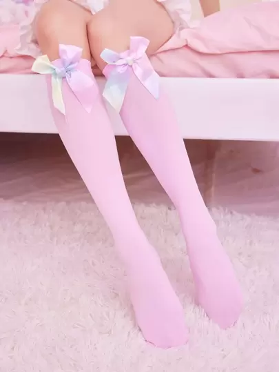 ROMWE Kawaii 蝴蝶结装饰过膝袜 - 粉色 - 查看 1