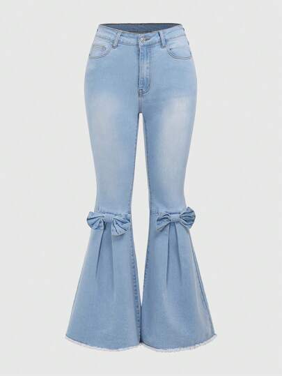 ROMWE Kawaii 女式 Himekaji 喇叭牛仔裤配蝴蝶结装饰,学校风