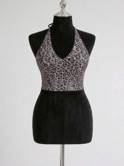 ROMWE 豹纹亮片露背性感吊带深V领露背背心,大码女款,适合派对、音乐节等场合