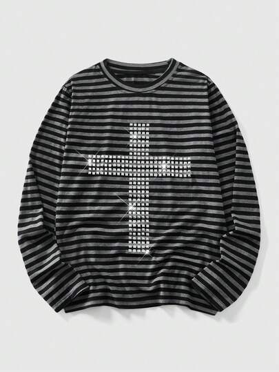 ROMWE MEN Goth 男士条纹铆钉十字修身长袖T恤 - 黑與白 - 查看 1