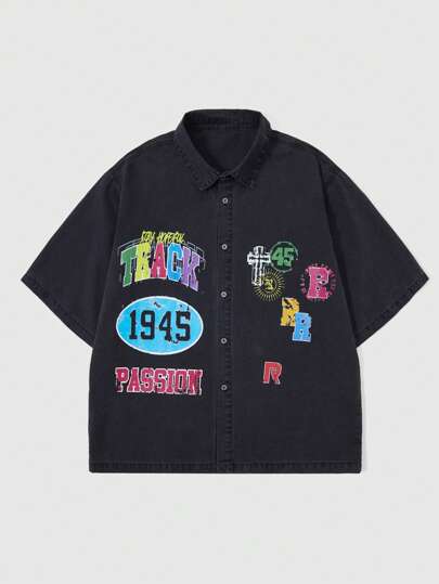 ROMWE MEN Prep 男士单排扣落肩短袖字母印花休闲牛仔衬衫 - 黑色 - 查看 1
