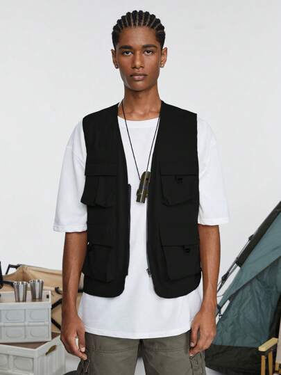 ROMWE MEN Street Life 1件男式拉鍊多口袋背心外套