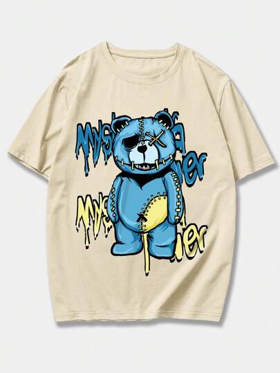 ROMWE MEN Street Life 男士熊和字母圖形下垂肩t恤 - 卡其色 - 查看 1