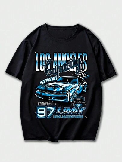 ROMWE MEN Street Life 男士汽车与字母图案棒球 T 恤,学校 - 黑色 - 查看 1