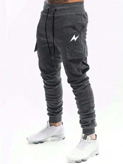 ROMWE MEN Street Life 男士抽绳腰部闪电印花运动裤,学校 - 深灰色 - 查看 1