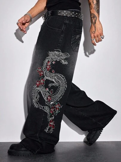 ROMWE MEN Street Life 男士休闲时尚街头刺绣中国龙与花卉图案水洗宽松阔腿牛仔裤 - 黑色 - 查看 1