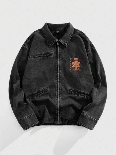 ROMWE MEN Street Life 男士时尚印花长袖牛仔夹克 - 黑色 - 查看 1
