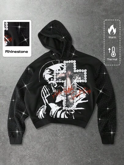 ROMWE MEN Street Life 男士连帽卫衣 耶稣圣母十字架英文文字印花水钻拼布 街头美式连帽衫 秋冬 - 黑色 - 查看 1