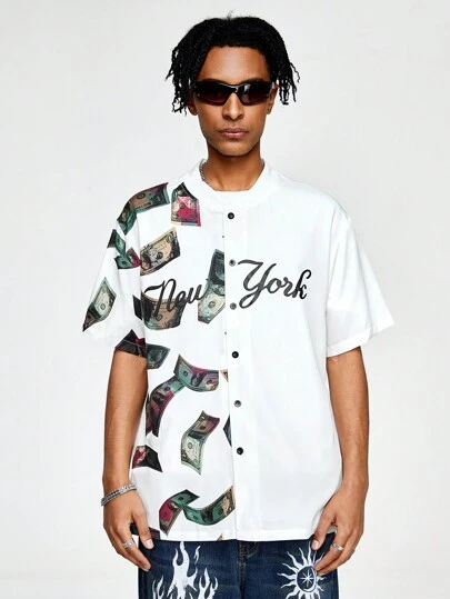ROMWE MEN Street Life 男士美元和字母印花短袖襯衫 - 白色 - 查看 1