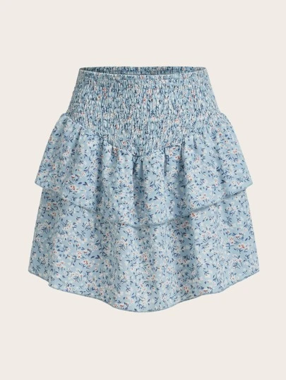 ROMWE 度假风格休闲碎花荷叶边下摆半身裙 - 淺藍色 - 查看 1