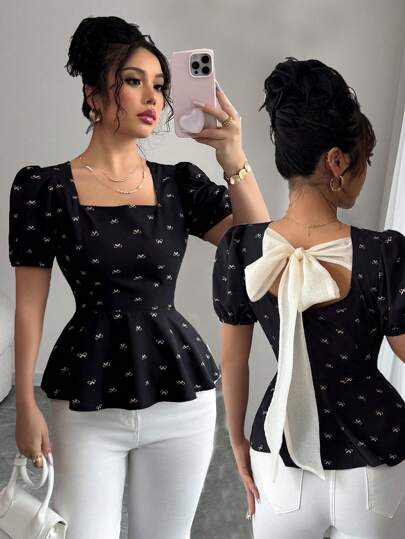 Rafferiza 休闲年轻优雅荷叶边蝴蝶结后背衬衫 - 黑色 - 查看 1