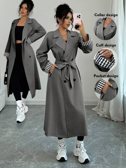 Rafferiza 宽松翻领双排扣长袖格子拼接女式风衣 - 灰色 - 查看 4