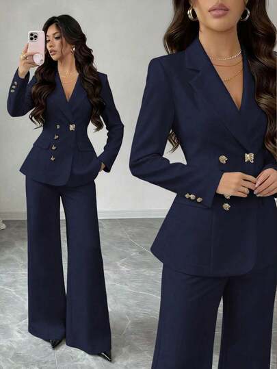 Rafferiza 简约法式风格纯色不对称搭扣装饰修身商务套装,女士款 - 藏蓝色 - 查看 1