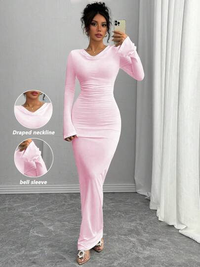 Rafferiza 纯白色优雅 V 领褶饰腰部喇叭袖长裙,秋季 - 淺粉色 - 查看 1