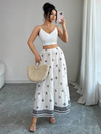 Rafferiza 女士度假旅行沙滩印花层叠波西米亚风半身裙,夏季 - 黑與白 - 查看 1