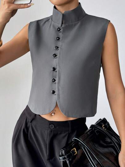 Rafferiza 女式纽扣设计立领无袖休闲衬衫 - 深灰色 - 查看 6