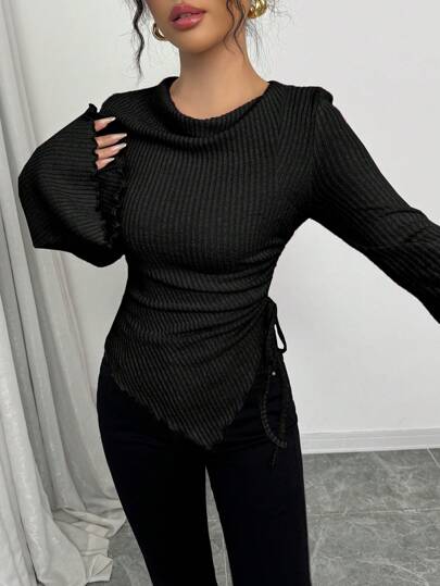 Rafferiza 女式破洞罗纹圆领喇叭袖不对称抽绳下摆 T 恤,秋冬款 - 黑色 - 查看 1