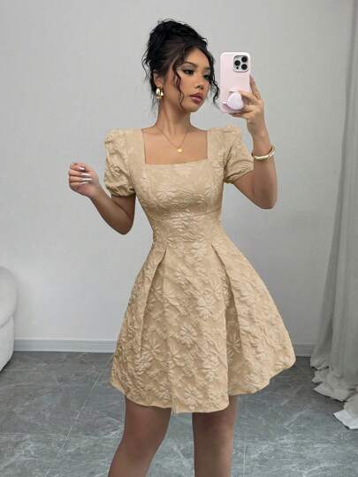 Rafferiza 女士优雅提花泡泡袖方领连衣裙 - 卡其色 - 查看 1