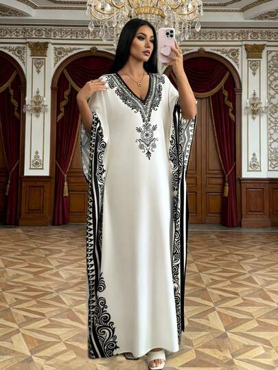 Rafferiza 女士优雅几何印花宽松圆领连衣裙,适合通勤、春夏穿着 - 彩色 - 查看 1