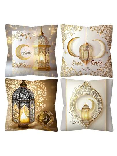 斋月庆典 4 件套枕套 - 17.72 英寸方形,金色和白色,带有优雅的新月和灯笼设计,拉链开合,可机洗 - 非常适合客厅、卧室、室内/室外装饰