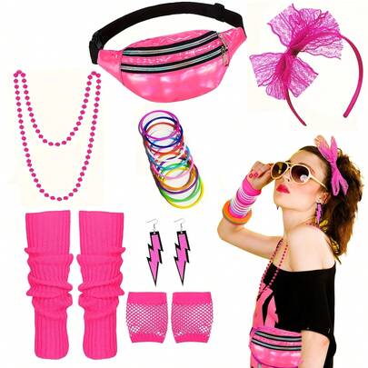 18件套80、90年代复古女装配饰套装,包括蕾丝发箍、耳环、项链、手链、手套和腿套,适合80年代复古派对、化装舞会、复古派对等场合。