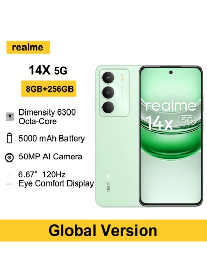 Realme 14X 5G AI 手机 8GB+256GB LTE,全球版,解锁手机,安卓 15 智能手机,联发科天玑 6300 处理器手机,5000mAh 大电池手机,品质可靠,圣诞礼物/赠品,不含充电器 - 綠色 - 查看 1