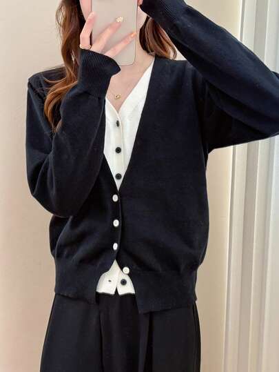 Alicedudu 女士秋冬优雅简约V领二合一毛衣开衫 - 黑色 - 查看 1
