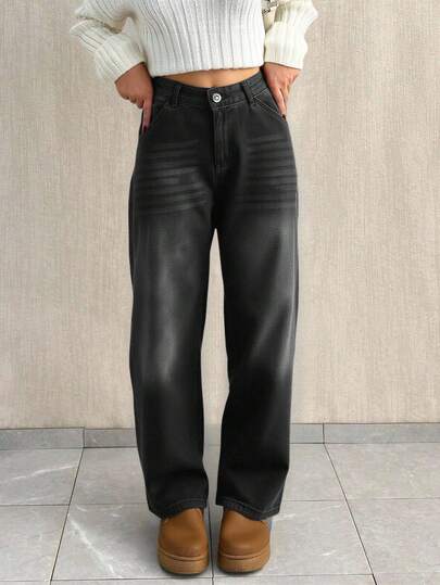 EURMUSE 低腰宽松直筒牛仔裤 - 深灰色 - 查看 1