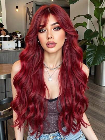 红色长卷发波浪形合成耐热假发,带刘海,女士假发,适合日常佩戴,服装假发,角色扮演派对礼物,圣诞节冬季 Y2K 假发 - 紅色 - 查看 1
