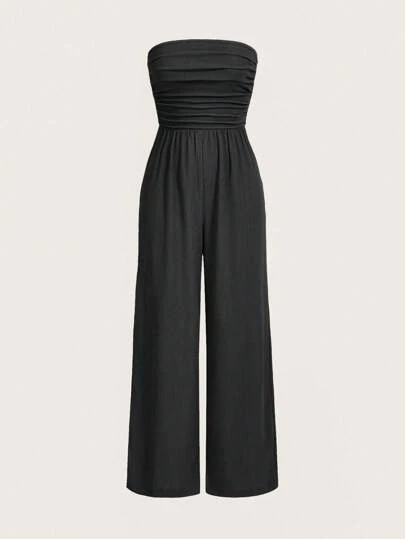 SHEIN EZwear 女士时尚纯色露肩收腰连体裤 - 黑色 - 查看 1