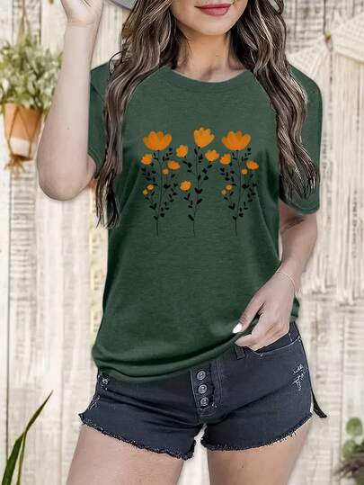 常規版型圓領花卉印花 T 卹 - 綠色 - 查看 1