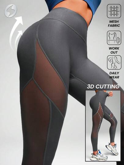 Innovista 女士纯色高腰拼接网眼健身紧身裤 - 深灰色 - 查看 1