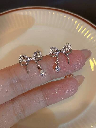 水鑽蝴蝶結裝飾耳墜 - 銀色 - 查看 1