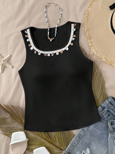 SHEIN LUNE 女士度假休闲吊坠装饰背心 - 黑色 - 查看 1