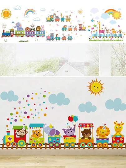 带有火车图案的可移除墙贴,动物卡通即撕即贴儿童房装饰贴纸,易于粘贴幼儿园艺术(返校主题) - 彩色 - 查看 10